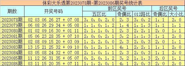 体彩大乐透第2023086期奖号为03 11 15 20 35 + 07 11,前区号码五区比为1:1:2:0:1,奇偶比为4:1,012路比为2:0:3,后区号码奇偶比为2:0,大小比为2:0。
