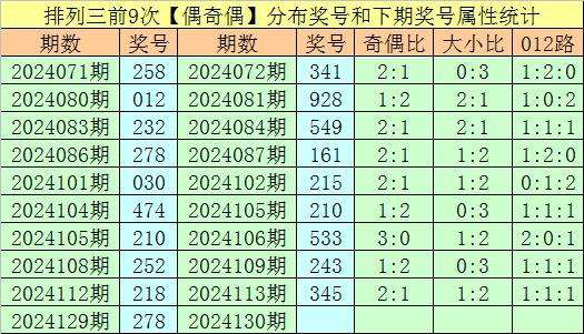 上期回顾:排列三第2024129期开出奖号278,类型为:偶奇偶、212路和小大大。