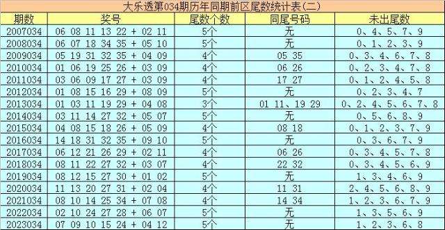 大乐透历年同期第034期后区尾数奇偶比为19:15,最近5年尾数奇偶比为3:7,后区尾数大小比为17:17,最近5年尾数大小比为4:6,本期后区注意号码06、07、08、09、10,后区两码关注07、08。