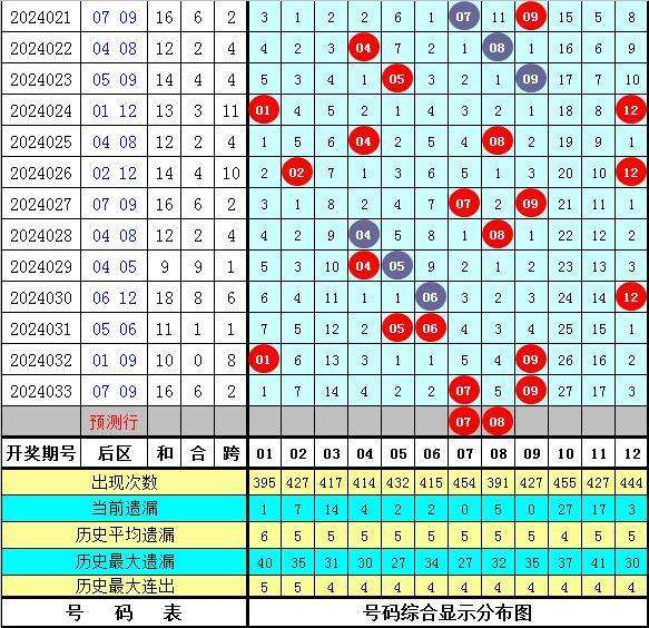 上期回顾:大乐透第2024033期开出奖号:04 08 10 11 15 + 07 09,前区包含5个尾数:0、1、4、5、8,后区开出全奇、全大组合。