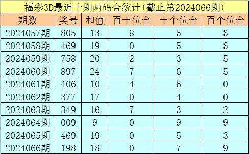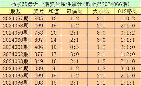 开奖回顾:第2024066期福彩3D奖号为198。奖号形态为组六,大小比为2:1,和值为18,奇偶比为2:1,012路比为1:1:1,跨度为8。