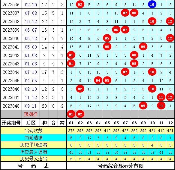 后区分析:后区上期开出奖号09 11,在最近15期开奖中奖,后区各号码频次分别为:号码10、12开出4次,号码02、05、07、08、11开出3次,号码01、04、09开出2次,号码06开出1次,号码03没有出现。本期预计后区在01、02、03、04、08、09之中出现,精选两码01+02。