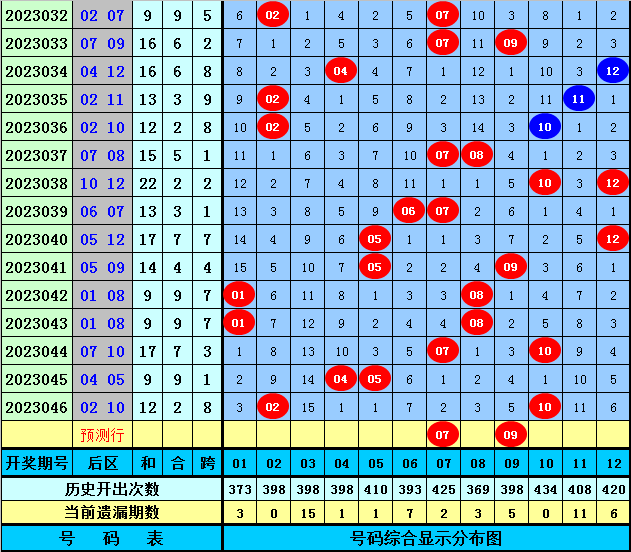 后区分析(定义:01-04为一区,05-08为二区,09-12为三区):上期后区开出奖号02和10,分别出现在第一区和第三区和区,最近10期后区三个区间落号个数比为4:10:6,本期后区注意第二区和第三区号码出现,关注两码07、09。