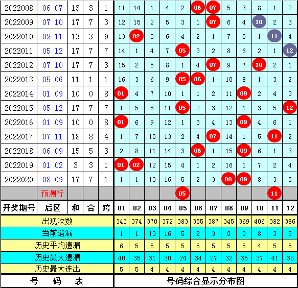 6、在历史同期第021期开奖中,后区一大一小组合出现9次,全大组合出现4次,全小组合出现2次,本期后区注意一大一小组合出现,关注号码04、05、09、11。