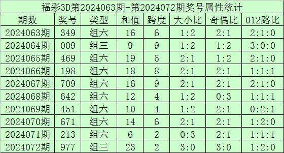 开奖回顾:福彩3D第2024072期开奖号:977,其中奖号和值:23,奇偶比3:0,大小比3:0。