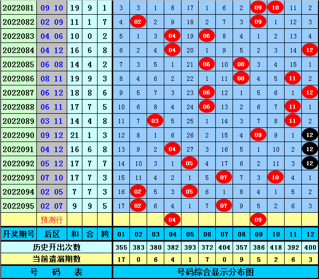 后区分析【一区01-04,二区05-08,三区09-12】:上期后区奖号为02和07,分别落在第一、二区,近50期后区三区比为30:34:36,近10期三区比为4:7:9,本期注意第一、三区号码出现,关注两码04+09。