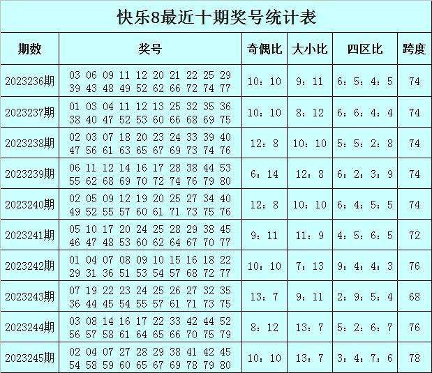 福彩快乐8第2023245期开奖回顾:02 04 07 27 28 29 38 41 42 45 54 58 59 60 65 67 69 78 79 80,其中奖号奇偶比开出10:10,大小比开出13:7,包含3个小奇号码:07 27 29,4个小偶号码:02 04 28 38,7个大奇号码:41 45 59 65 67 69 79,6个大偶号码:42 54 58 60 78 80。