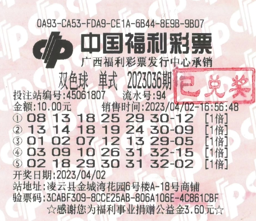 4月2日,中国福利彩票双色球游戏第20230036期开奖,当期双色球红球号码为13、14、18、19、24、30,蓝球号码为09。当期共计中出双色球一等奖24注,单注奖金556万多元,其中黑龙江1注,江苏5注,浙江3注,安徽1注,山东3注,重庆1注,河南5注,广西3注,陕西1注,新疆1注,共24注。二等奖开出271注,单注奖金6。2万多元。