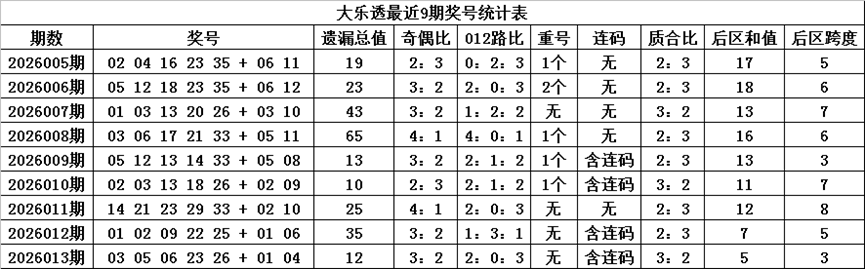体彩大乐透第2026013期奖号为:03 05 06 23 26 + 01 04,各位号码遗漏期数分别为:2期、3期、4期、1期、2期+0期、9期,前区号码遗漏总期数为12期,012路比为2:0:3,奇偶比为3:2,没有开出重复号码。后区号码遗漏总期数为9期,和值为5,跨度为3。