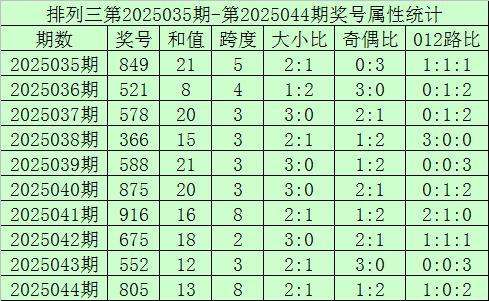 上期回顾:排列三第2025044期开奖号:805,奖号和值:13,奇偶比1:2,大小比2:1。