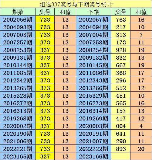 第2023165期3D奖号为:337,历史上该号码直选开出5次,下期号码分别为:928、667、368、004。