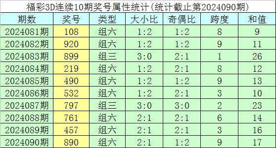 开奖回顾:福彩3D第2024090期奖号为890。奖号形态为组六,大小形态为大大小,奇偶形态为偶奇偶,和值为17,跨度为9。