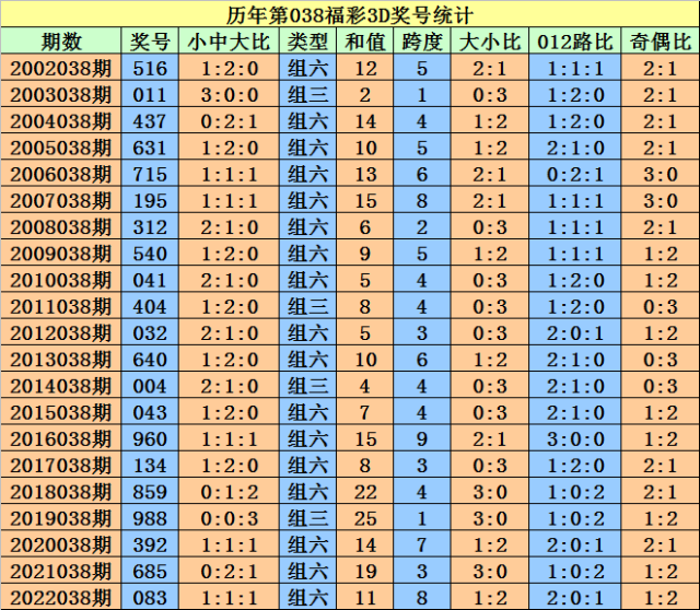 开奖回顾:福彩3D第2022038期奖号为:083。