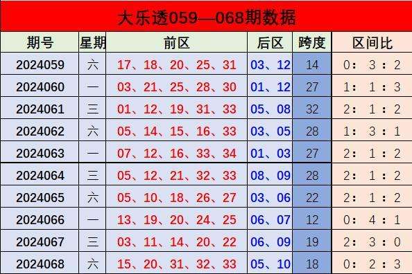 大乐透上期奖号为:前区15 20 31 32 33,后区05 10;前区号码区间比0:2:3,跨度18。
