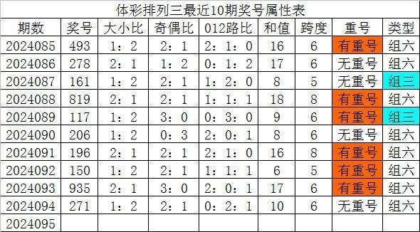 体彩排列三最近10期分别开出奖号:493、278、161、819、117、206、196、150、935、271,各奖号属性详见下表:
