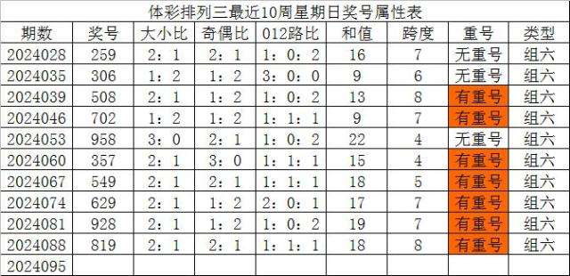 体彩排列三最近10周星期日奖号分别为:259、306、508、702、958、357、549、629、928、819,各奖号属性详见下表: