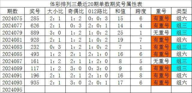 体彩排列三最近20期单数期奖号分别为:285、626、889、928、232、493、161、117、196、935,各期奖号详细属性下表: