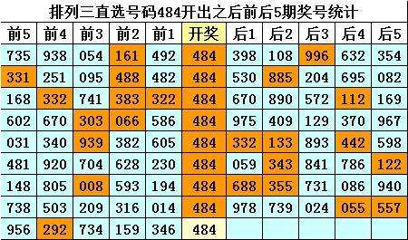 四、排列三直选号码484历史上开出9次,其前后五期奖号分别为: