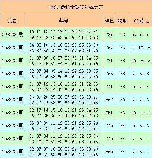 快乐8第2023238期奖号为:02 03 07 18 20 23 24 33 39 40 47 56 61 63 65 67 69 73 74 76,其中奖号012路比为7:6:7,和值为860,跨度为74。