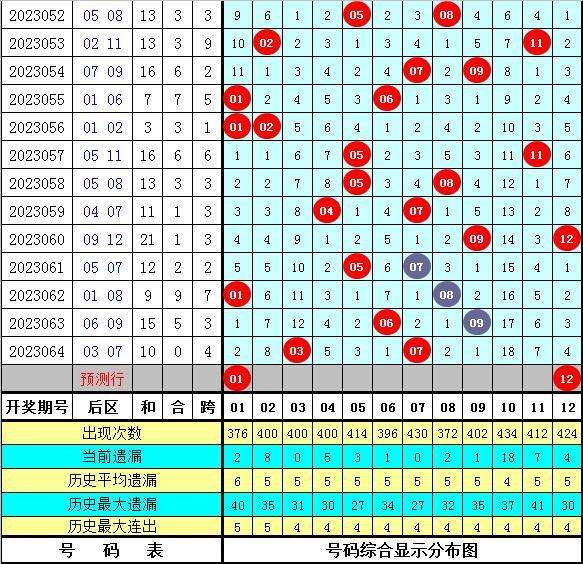 后区号码分析:上期后区开出奖号03 07,在最近20期开奖中,后区各号码频次分别为:号码05、07出现5次,号码09、11、12出现4次,号码01、02、04、06、08出现3次,号码03出现2次,号码10出现1次。本期后区参考号码01 03 05 07 12,单挑两码01 12。