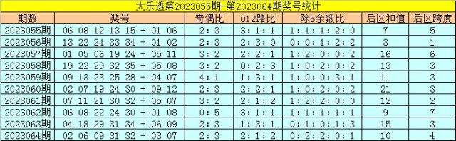 上期回顾:体彩大乐透第23064期奖号开出:02 06 09 31 32+03 07,前区奖号和值为80,跨度为30,除5余数比为0:2:2:0:1,遗漏总值为10,后区奖号和值为10,跨度为4。