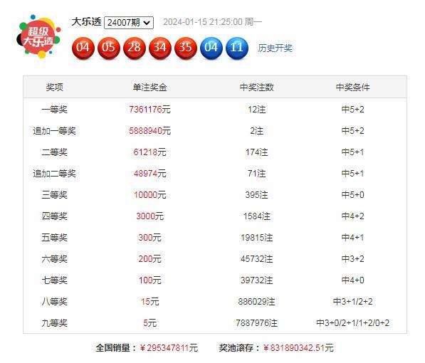 大乐透第2024007期开出奖号为:04、05、28、34、35+04、11。其中前区奇偶比为2:3,三区比为2:0:3,大小比为3:2,后区开出一奇一偶组合。