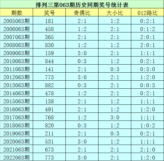 排列三第2023063期开奖日期:2023年3月14日,历史上第063期已开出了18次奖号,历年同期号码分别为:181、458、365、830、159、844、141、773、882、478、138、491、768、820、211、531、673、773。