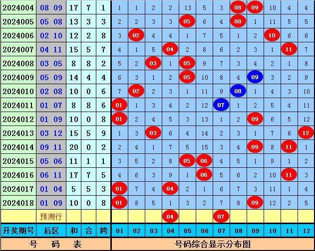 后区分析:上期后区开出1路+0路号01和09,最近30期后区奖号012路比为18:20:22,最近10期后区奖号012路比为8:6:6,本期后区注意号码04、07、08、11、12,单挑两码组合04、07。