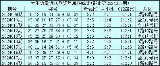 大乐透第2024018期开奖号码:04 12 19 25 27 + 01 09。前区奖号大小比为3:2,奇偶比为3:2,012路比为2:3:0,后区为1路+0路号。