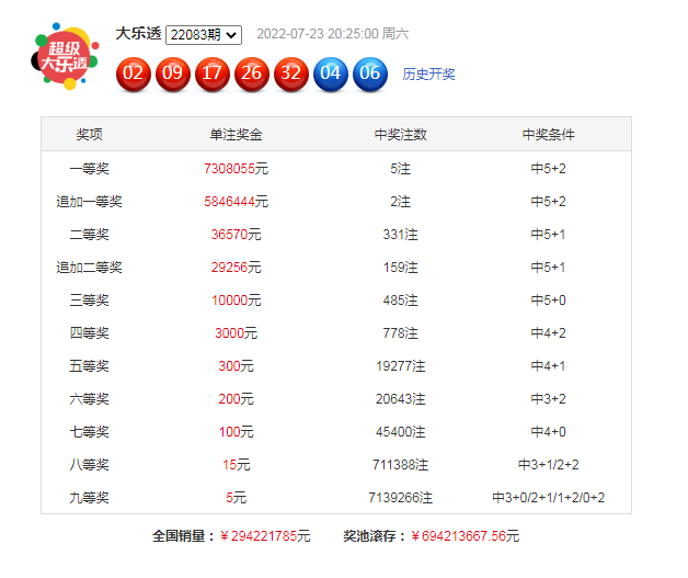 大乐透第2022083期开奖,前区:02、09、17、26、32;后区:04、06。其中前区012路比为1:0:4,奇偶比为2:3,和值为86,跨度为30,后区开出1路+0路号码。