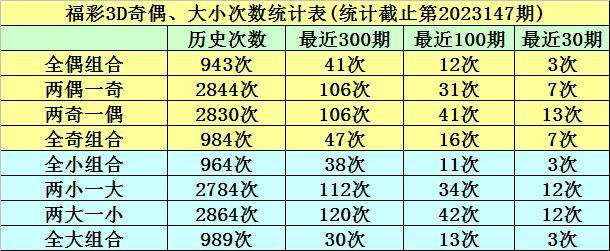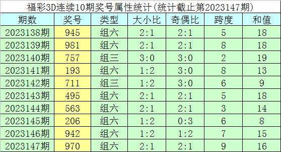 开奖回顾:福彩3D第2023147期奖号为970。奖号形态为组六,大小形态为大大小,奇偶形态为奇奇偶,和值为16,跨度为9。