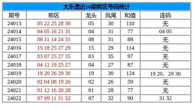体彩大乐透第24022期奖号开出:07 09 11 31 32 + 04 08,当期龙头07,凤尾32,连码31 32,和值90。