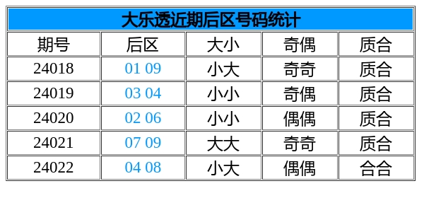 后区分析:上期后区开出04 08,小大、偶偶、合合形态。近5期大小比4:6、奇偶比5:5、质合比4:6,小数、合数占比较高,本期重点关注后区开出小大、偶奇、合合,双胆06 09。