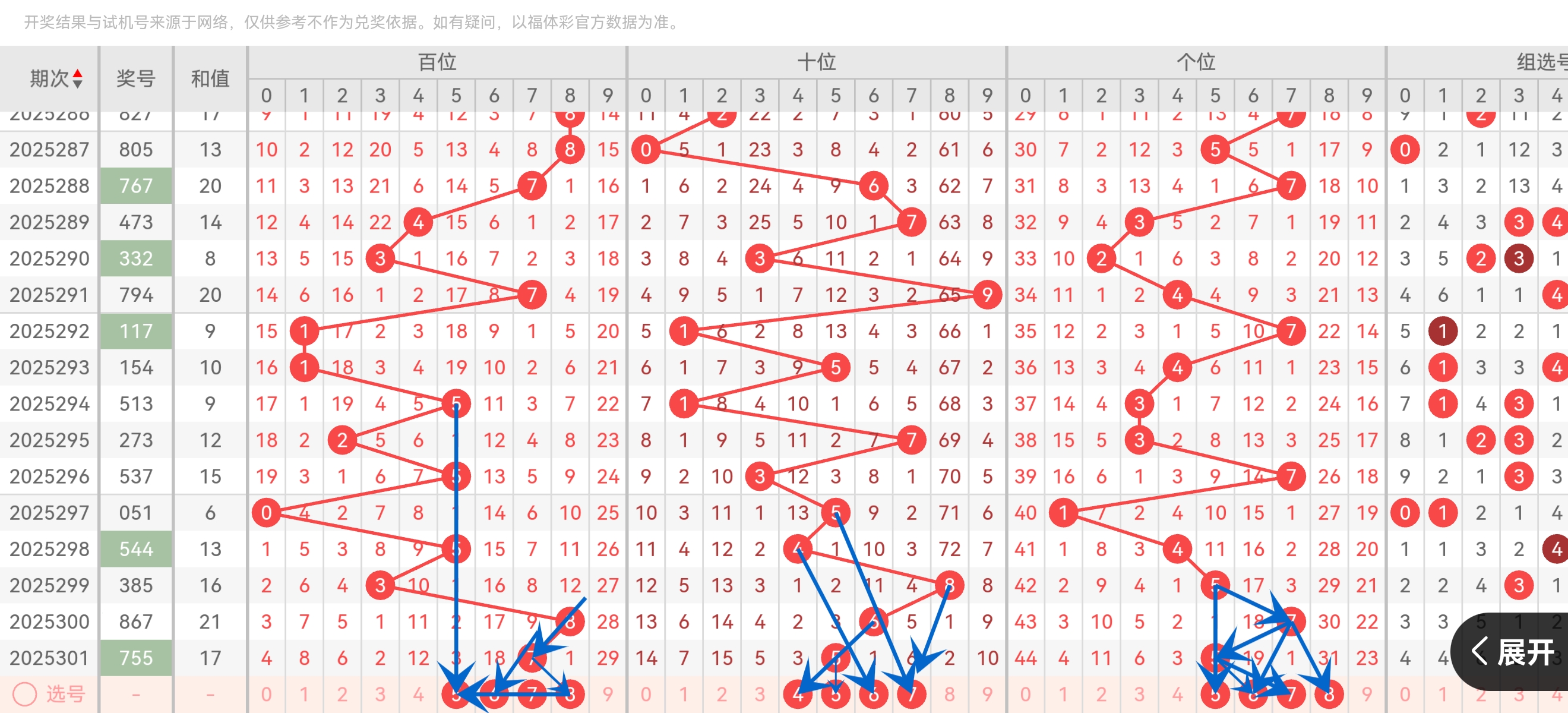 推断趋势 :百位可能延续中高位数字(6-9);十位和个位以中段数字(4-7)为主,尤其5是热号;组六复式可优先关注热号;直选组合避免历史重复号码(051、544、385、867、755),并参考和值(15-18)和跨度(2-5)。