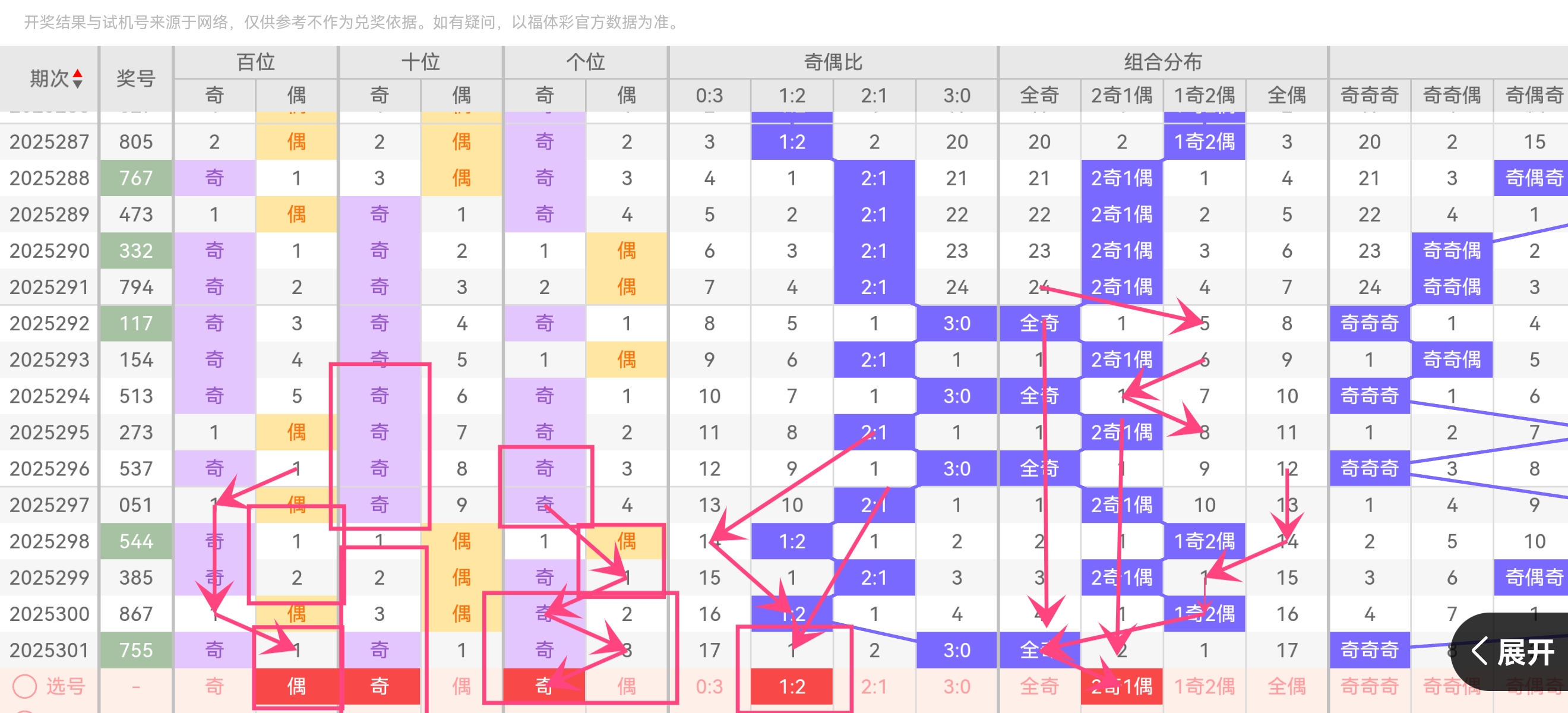号码类型 :组六(051、385、867)、组三(544、755),表明组六出现频率较高(3/5)。