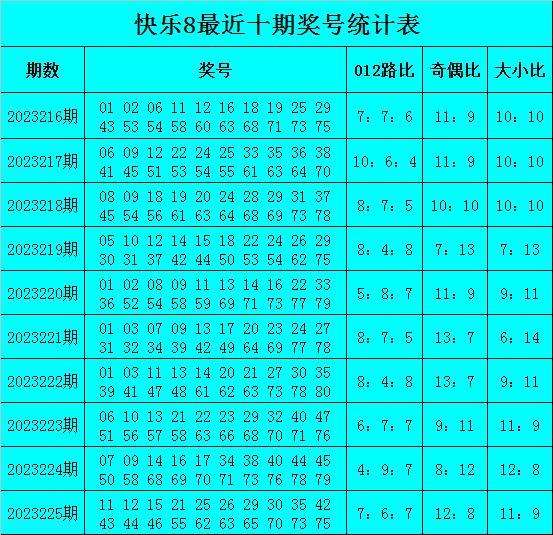 福彩快乐8第2023225期开奖回顾:11 12 15 21 25 26 29 30 35 42 43 44 46 55 62 63 65 70 73 75,其中奖号012路比为7:6:7,各路号码走势基本平衡。