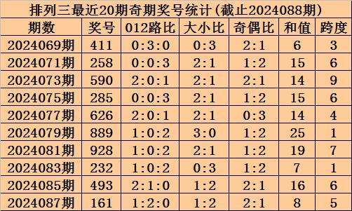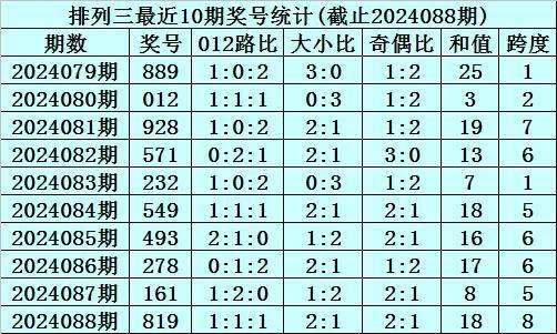 上期回顾:排列三2024088期奖号为819,奇偶比为2:1,大小比为2:1,跨度为18。