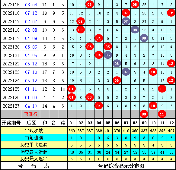 前区0路号码:上期开出2个0路前区号码:03、09,上期走温。最近10期开出12个0路前区号码,其中小号0路前区号码表现活跃,奇数0路前区号码热出,另外最近10期0路前区号码:06、12、18、24、27没有出现。本期参考0路前区号码:15 18 24 27 30 33。