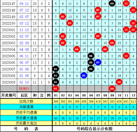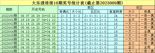 上期回顾:体彩大乐透第2023009期开出奖号:01 05 11 15 33 + 01 10。其中前区奖号奇偶比为5:0,大小比为1:4,五区比为2:1:1:0:1,跨度为32。后区奖号大小比为1:1,奇偶比为1:1。
