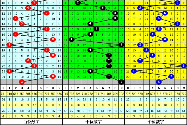 百位:2022023期-2022027期出号:84518,振幅为7点,分布比较分散,本期看好百位走小,关注3。