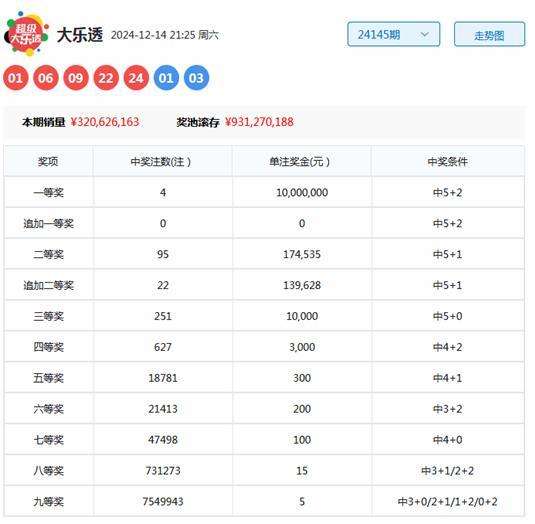 大乐透第2024145期开出奖号:前区01、06、09、22、24,后区01、03。当期前区012路比为3:2:0,奇偶比为2:3,和值为62,跨度为23,后区奖号全在一区。
