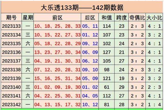 大乐透第2023142期开奖号码:前区04 13 15 17 32,后区10 12;龙头04,凤尾32,和值81,跨度28,前区号码区间比1:3:1,012路比1:2:2,奇偶比为3:2,大小比为1:4,冷热比3:2,1枚重号,0组连号。