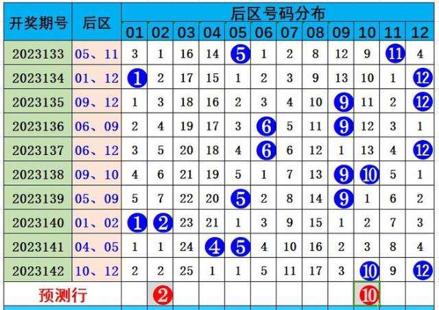 上期后区号码为10号和12号,为大大、偶偶组合,近10期后区大小比为11:9,后区近五期奇偶比为5:5。本期后区五码参考01 02 07 08 10,本期两码参考小大、偶偶组合02、10。