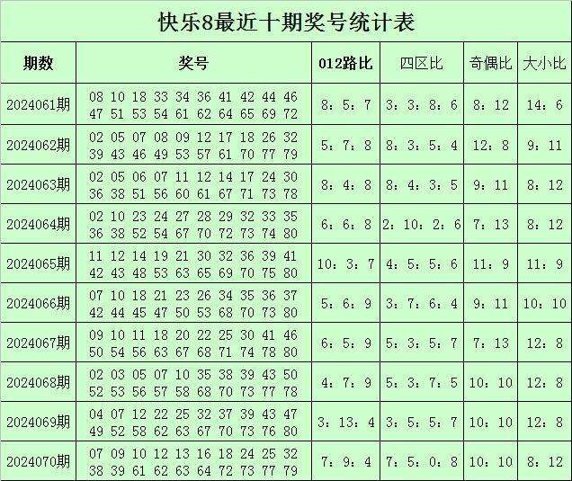 福彩快乐8第2024070期开奖回顾:07 09 10 12 13 16 18 24 25 32 38 39 61 62 63 64 72 73 77 79,其中奖号012路比为7:9:4,四区比为7:5:0:8,奇偶比为10:10,大小比为8:12。
