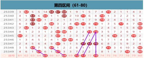 本区上期开出4码的区间布局,那么在本期我们优先考虑的就是重码是否可以考虑接力的可能性,再考虑同路的位置上的择一出号的可能性,如果再78 80 的位置上我们考虑的是重码的可能性,那么再64 67的位置上我们考虑的就是分边的出号,那么如果再64 67的位置上考虑重码的出现的话,那么可以考虑一重一分的可能性,和做一放一的点位,再空位上我们关注的就是71 72 73的放空点位的回补点,优先考虑的就是本身的回补点位,71 72 73的择一出号,防守分边点位的70 74的出号,那么其他位置上就不是我们考虑的重点位置了。