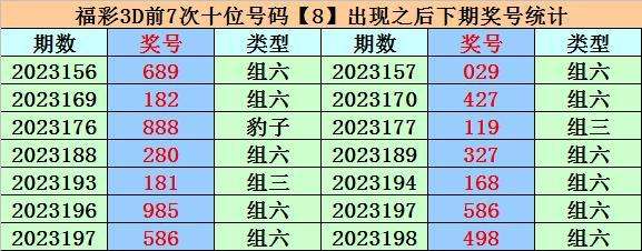 在十位开奖中,号码8前7次出现之后,下期奖号分别为:2、2、1、2、6、8、9,其中奖号大小比为3:4,012路比为2:1:4,奇偶比为2:5。