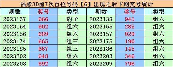 在百位号码6前7次开出之后,其下期分别开出号码:9、2、0、1、1、3、7,其中号码奇偶比为5:2,大小比为2:5,012路比为3:3:1。
