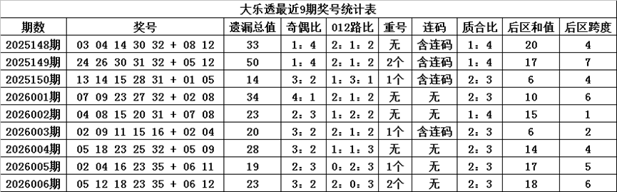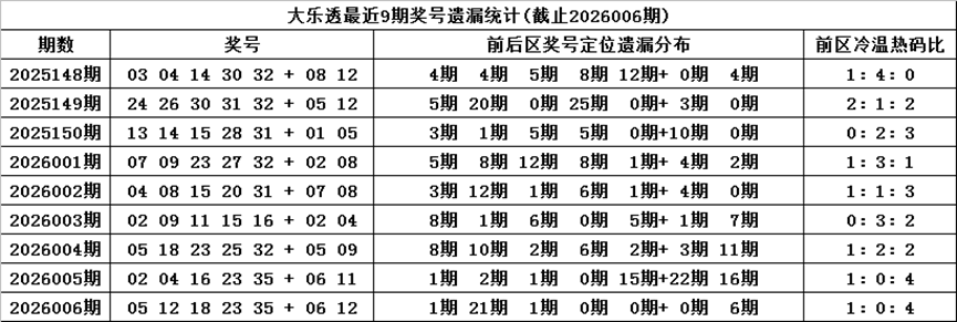 体彩大乐透第2026006期奖号为:05 12 18 23 35 + 06 12,各位号码遗漏期数分别为:1期、21期、1期、0期、0期+0期、6期,前区号码遗漏总期数为23期,012路比为2:0:3,奇偶比为3:2,包含2个重复号码:23、35。后区号码遗漏总期数为6期,和值为18,跨度为6。