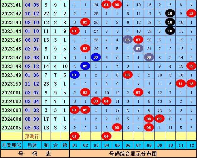 后区分析:上期该位开出奖号05和08,和值为13,跨度为3,后区前4次开出和值13和跨度3时,其下期奖号分别为:02+11、04+07、01+11、04+10,号码奇偶比为4:4,大小比为4:4,012路比为0:5:3,本期后区号码参考01、02、04、08、11,精选两码01、04。