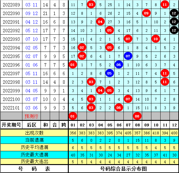 后区分析:上期后区奖号为03和06,最近十期后区开出9个热码、6个温码和5个冷码,本期预计奖号关注温码+冷码组合,参考两码01、08。